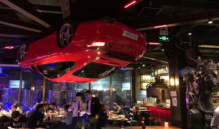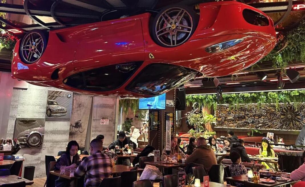 Walk into what looks like just another nightlife-driven restaurant in central Shanghai, and the atmosphere initially feels familiar enough with low lighting, loud conversations, the clink of glasses, and the faint hum of performance bravado in the air. Then you look up, and reality politely excuses itself. Suspended from the ceiling is a full-scale Ferrari F430, flipped completely upside down, its Rosso Corsa bodywork acting not as decor but as a functioning, rotating clock mechanism. According to diners who stumbled in expecting schnitzel and beer, the moment is equal parts disbelief and delight, the kind of visual punch that instantly resets expectations.