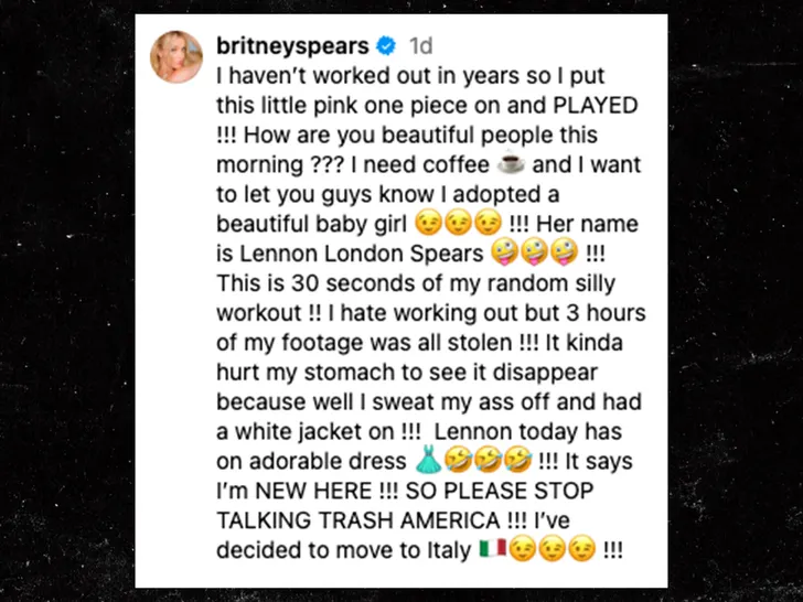 The confusion continued. In the same post, Britney claimed she was “moving to Italy,” a dramatic statement that sent even more followers into a state of speculation. Travel blogs reposted the claim. Italian fan pages extended warm welcomes. Some fans questioned whether the singer was expressing a desire to start a new chapter overseas.