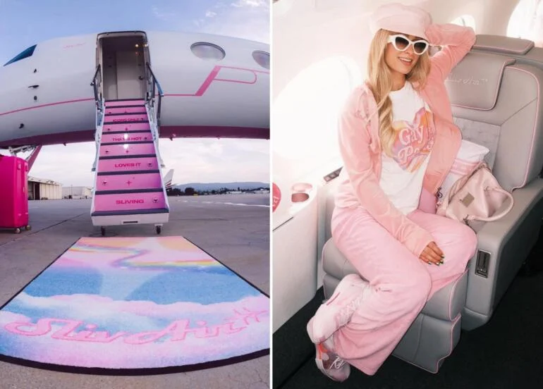 The aircraft, which underwent a full interior and exterior redesign, has been nicknamed “Sliv Air”: a nod to Hilton’s trademark blend of “slaying” and “living.” Designed by Marina del Rey–based aviation designer Sarah Mespelt Larrañaga, the jet emerged from a year-long makeover dripping in Parisian flair. From the moment one spots its gleaming pink fuselage on the tarmac, there is no mistaking the identity of its owner. Even the tail number, N11PH, is a discreet but deliberate wink to her initials.