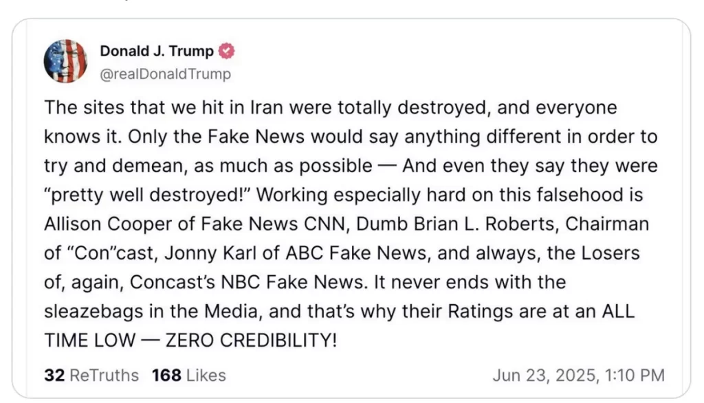 Trump did not stop there. He labeled NBC’s parent company as “Concast” and mocked cable giants in a thread that also praised the strike, stating that the targeted sites were “totally destroyed.” His post suggested a coordinated media effort to downplay the operation, even though many outlets acknowledged the facilities were “pretty well destroyed.” In the same breath, he disparaged Cooper’s gender identity and delivered a sweeping dismissal of “Fake News” that he claims lacks credibility.